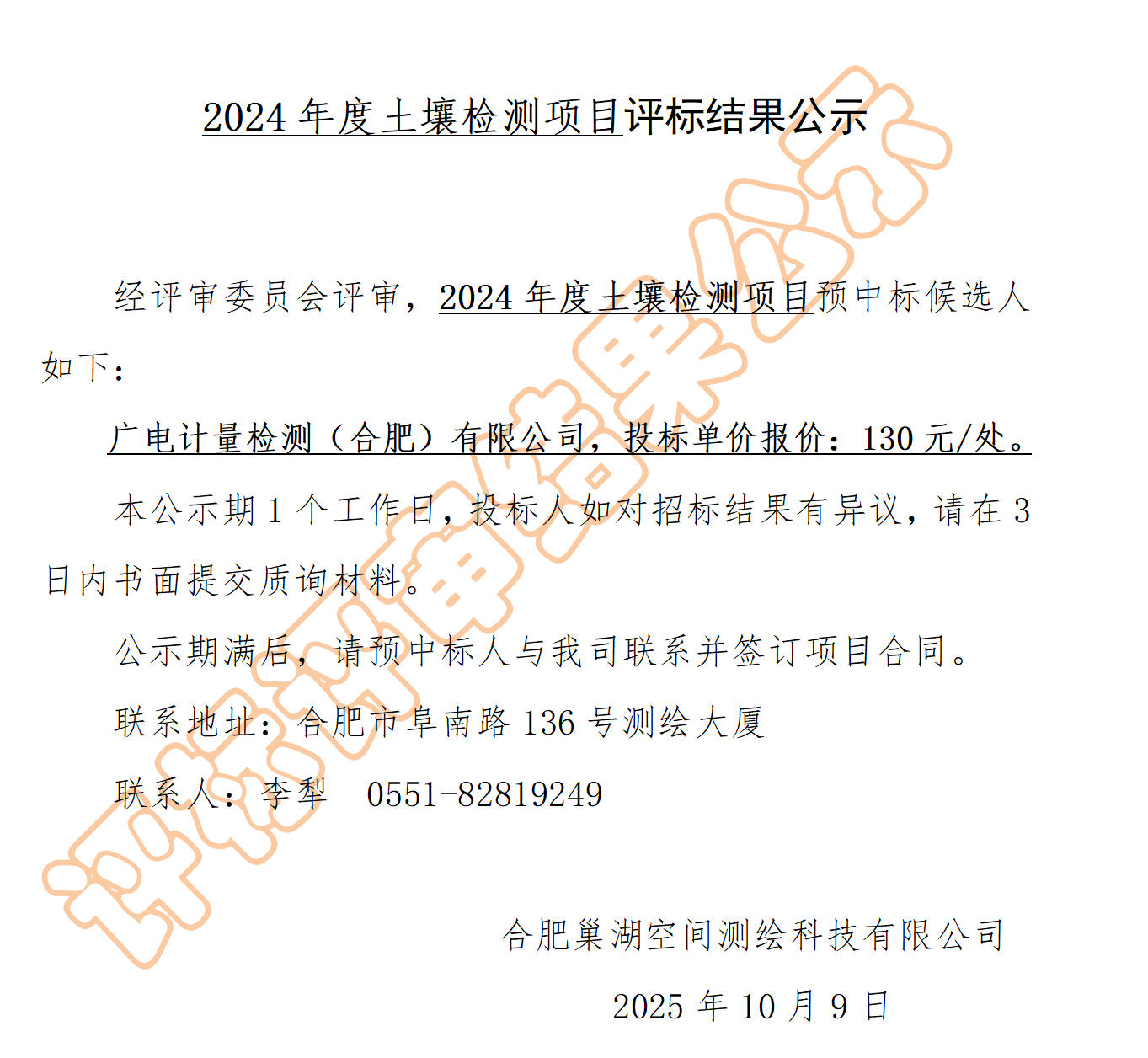 信息管理部01 采购信息公告 2025年10月09日 点击数:133 2024年度土壤检测项目评标结果公示 上一篇文章: 地下管线探测项目询价公告 上一页 下一篇文章: 2025年公司职工疗休养活动承办服务竞争性磋商公告 下一页