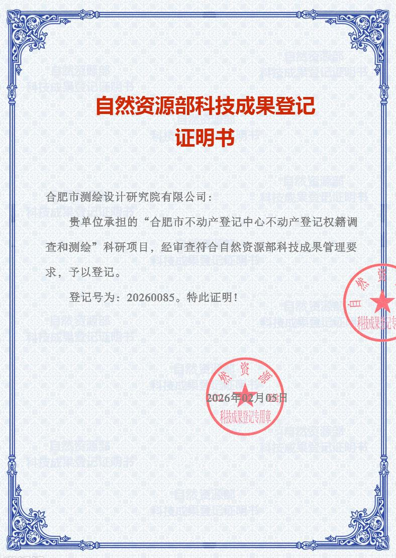 近日,公司技术质量部牵头完成《合肥市不动产登记中心不动产登记权籍调查和测绘》项目的科技成果登记工作,该项目经严格审查,符合自然资源部科技成果管理相关要求,成功获得自然资源部颁发的科技成果登记证明书。