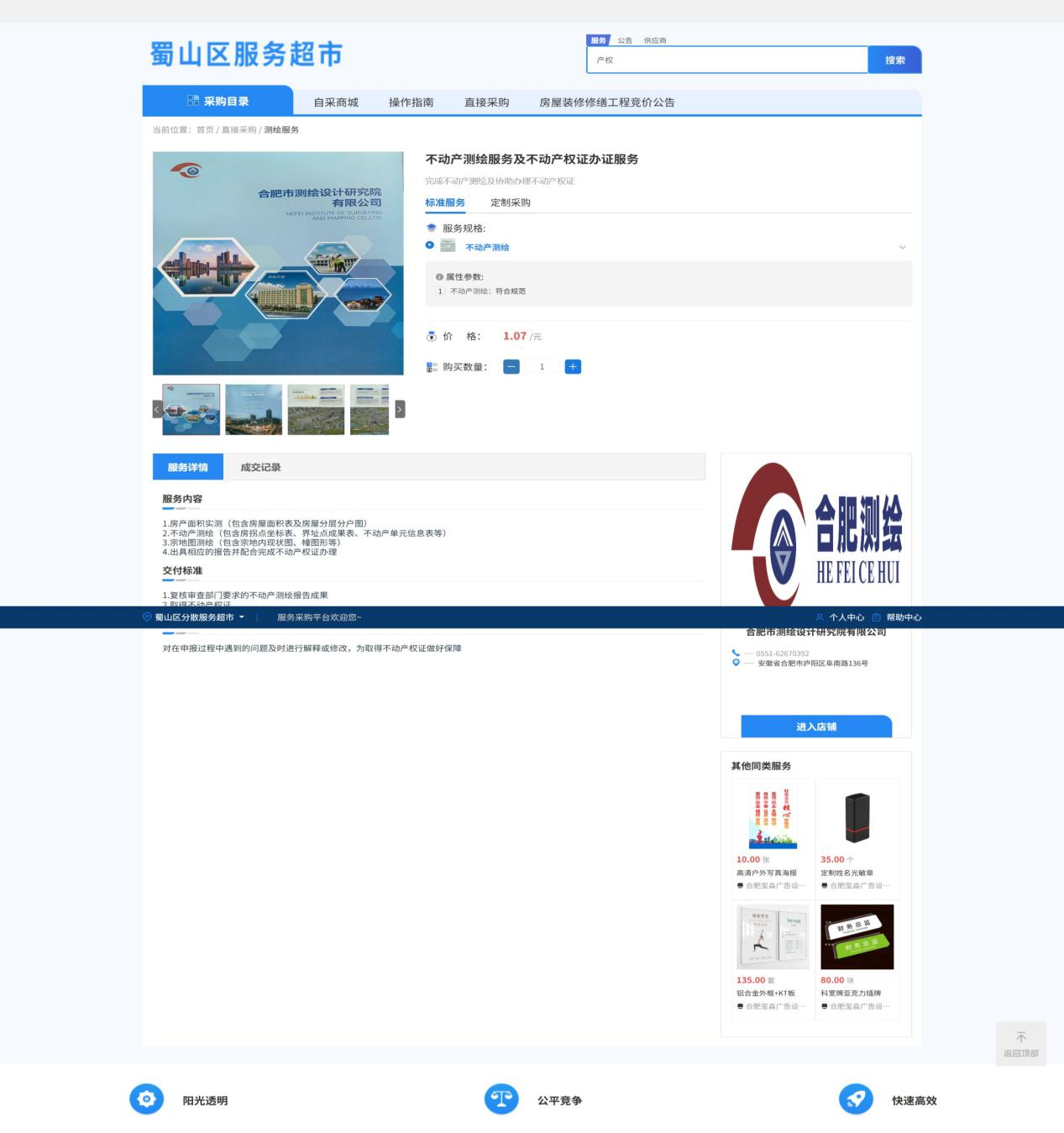 此次入驻蜀山区自采商城,是我司提升服务模式的新举措。用户只需登录商城服务超市搜索:“不动产测绘或不动产权办证”,即可在线查看服务内容、交付标准、售后服务等。方便在线浏览,一键下单。同时我司积极响应下单4小时内即有专人对接、成果交付后免费提供技术咨询。